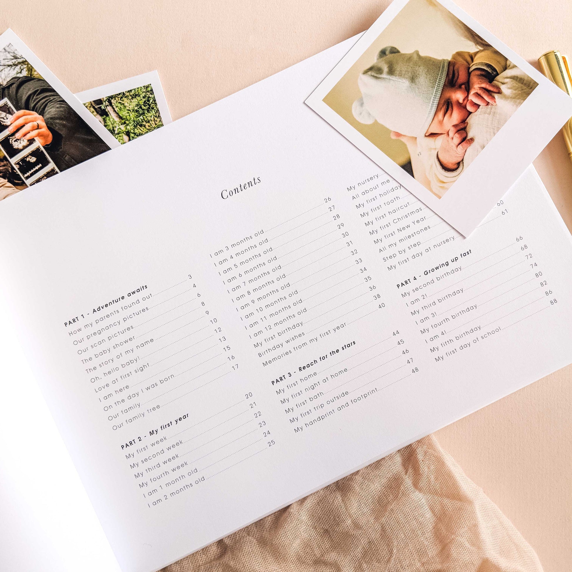 A beautiful baby memory book for new parents, or soon-to-be parents, to record all those special key milestones of your new born baby (from pregnancy to 5 years). Childhood is full of many beautiful memories to remember and this baby record book is the perfect place to store them all. From pregnancy pictures to their first day of school, this keepsake memory book will help you keep track of all the important moments you (and your baby) will want to remember in years to come.