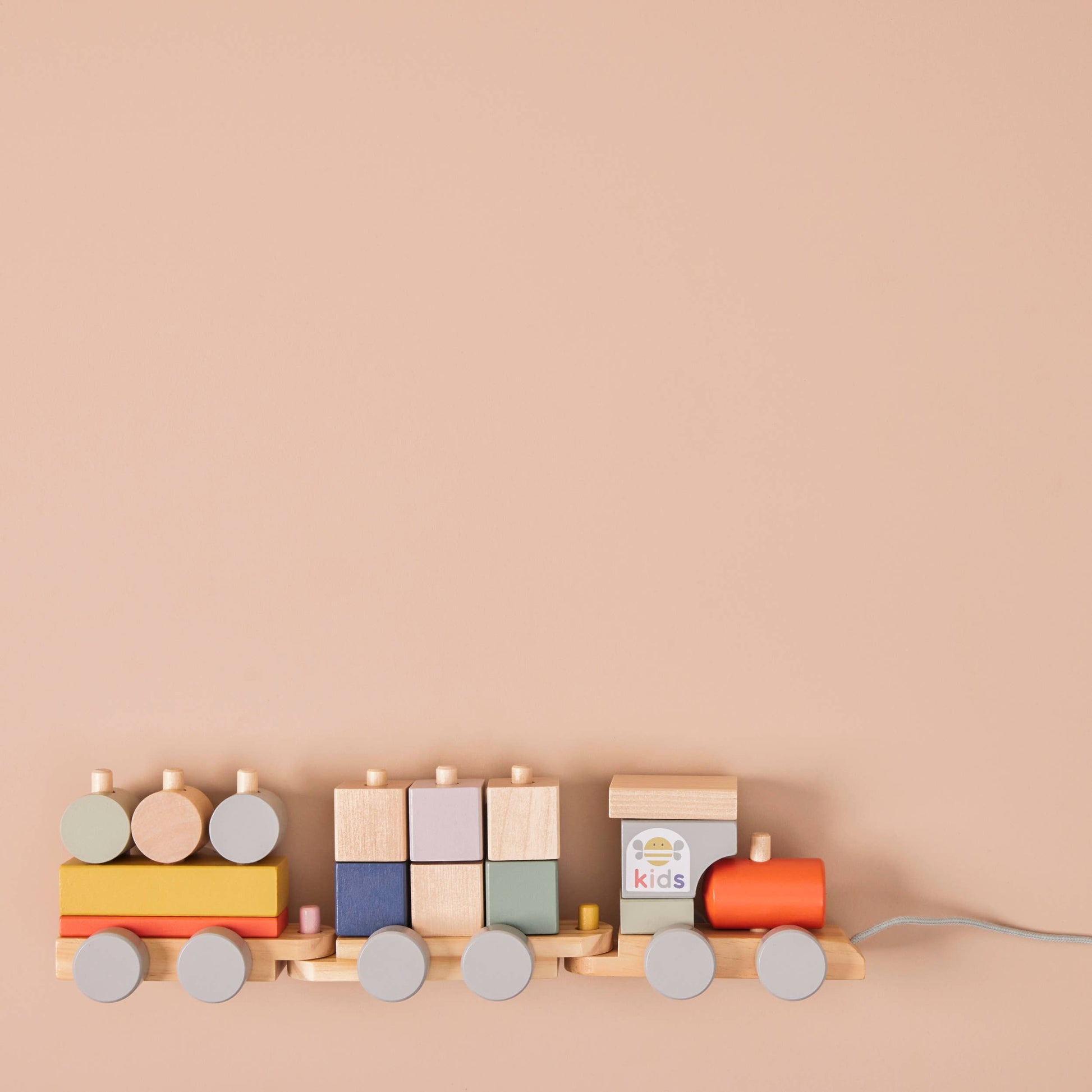 Playtime is full steam ahead with our wooden pull-along train. This adorable toy is crafted from high-quality wood and painted with beautiful rainbow tones. This three-carriaged train will trundle happily along the floor when pulled forward by small hands. Little learners can take the wooden blocks on and off, helping them differentiate colours and shapes while developing their hand-eye coordination and fine motor skills!