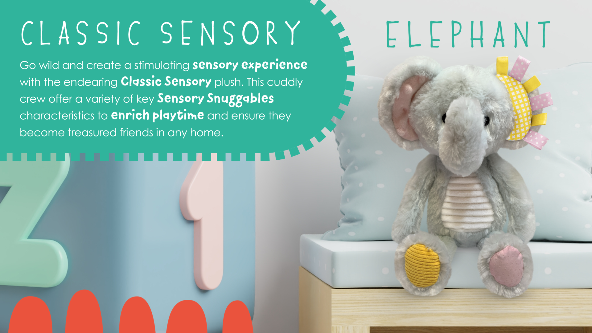 Stimulate your little one’s senses by exploring the Sensory Snuggables Elephant together.